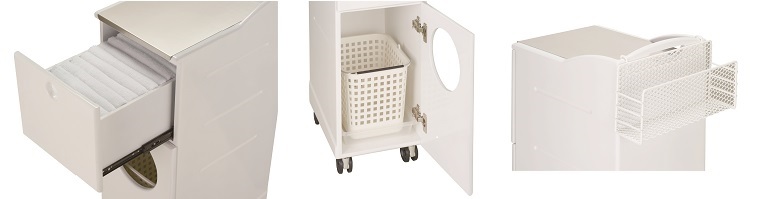 シャンプータオル約40枚、ガーゼ約40枚収納可能。 ご使用後の重いタオルもラクラク取り出せます。 フック2個付。 天板はステンレス材を使用してますので濡れたものそのまま置いてもOK。 また薬剤等をこぼしても簡単に拭き取れます。 取っ手の後ろにラック付