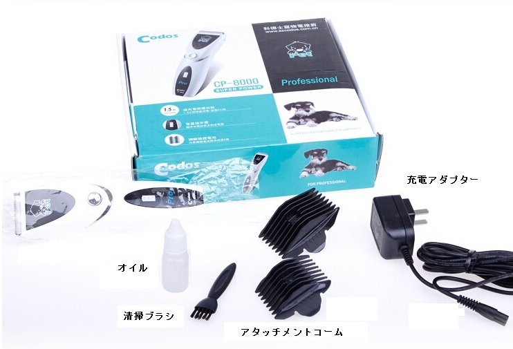 プロトリマーの手にフィットする握りやすさを実現。 充電タイプで約90分の充電で約120分使用可能。 毛の密度が多いペット用に開発した刃を使用。 コードレスなのでコードを噛まれる心配はありません。 機械音も静かなサイレントモーター使用。 ペット専用に開発された高トルク型モーターを採用したコードレスバリカン。 【CODOSバリカン】コドス(CODOS)プロペットバリカン CP-8000【ハイパワー】【超軽量】【プロ用】