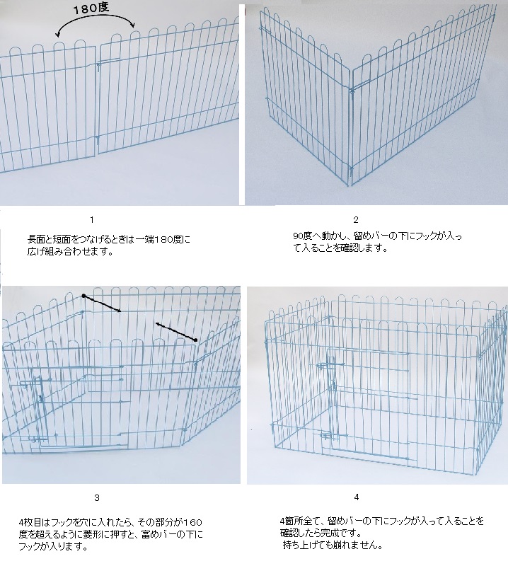 ケージやサークル等を長年研究し尽くした担当者が開発したサークルです。 独自の技法で、面倒な組立パーツがなく簡単に組み立てられます。 またご使用にならない時は、ばらして部屋の隅に置いておけば邪魔になりません。 耐食性に優れ、光沢があり強度も強く、主にプロのブリーダーにご愛用いただいております。