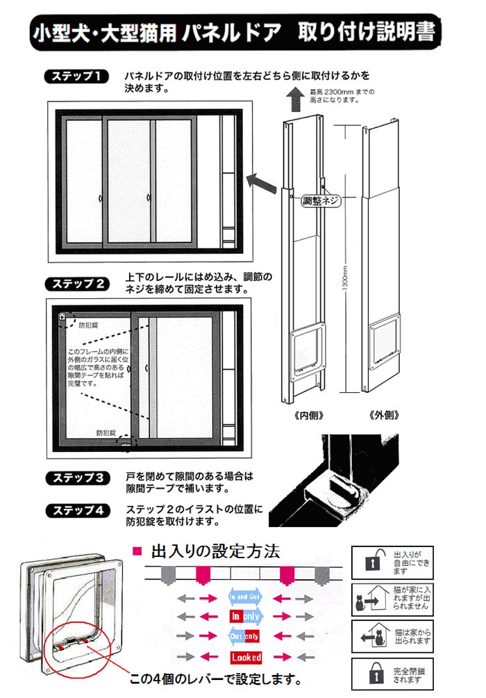 | 製品名 | 【工事不要サッシ取付型 大型猫用ペットドア】スチール製パネルキャットドアL (サッシ高1500mmH~2300mmH用)【売れ筋商品】【省エネ】【簡単】 |